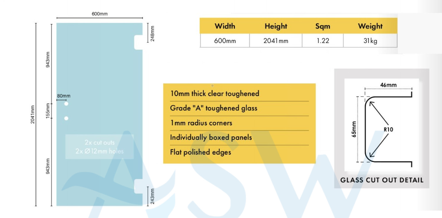 Frameless Shower Screen Door 600mm suitable for D-Handle, 10mm